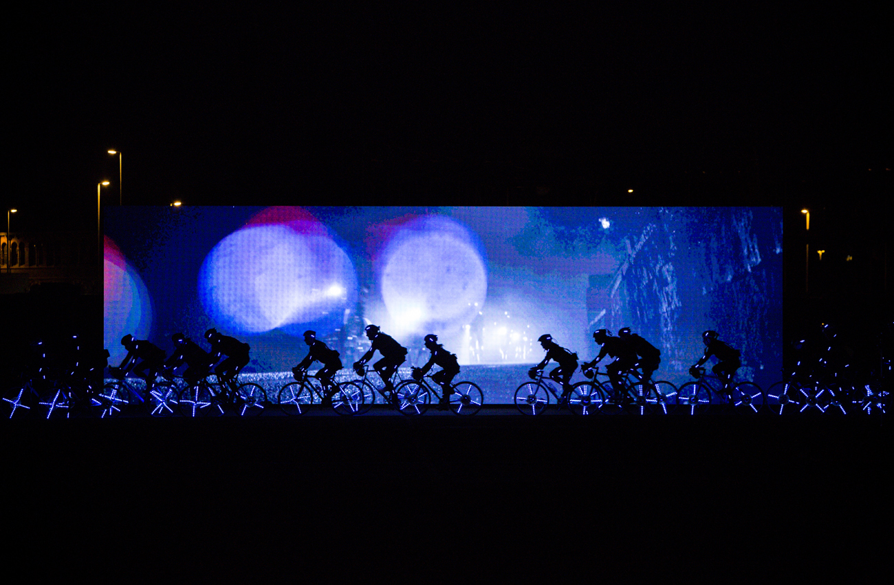 This latest work Ghost Peloton explores a new application of light, movement and landscape on racing bikes. Inspired by the wheel in motion, Ghost Peloton engages amateur cyclists and flatland BMX riders into a choreographed live performances set in an open-air velodrome. You can see the first results in a stunning short film [link] directed by Mark Huskisson which has been seen by 120,000 people since its recent global release.
