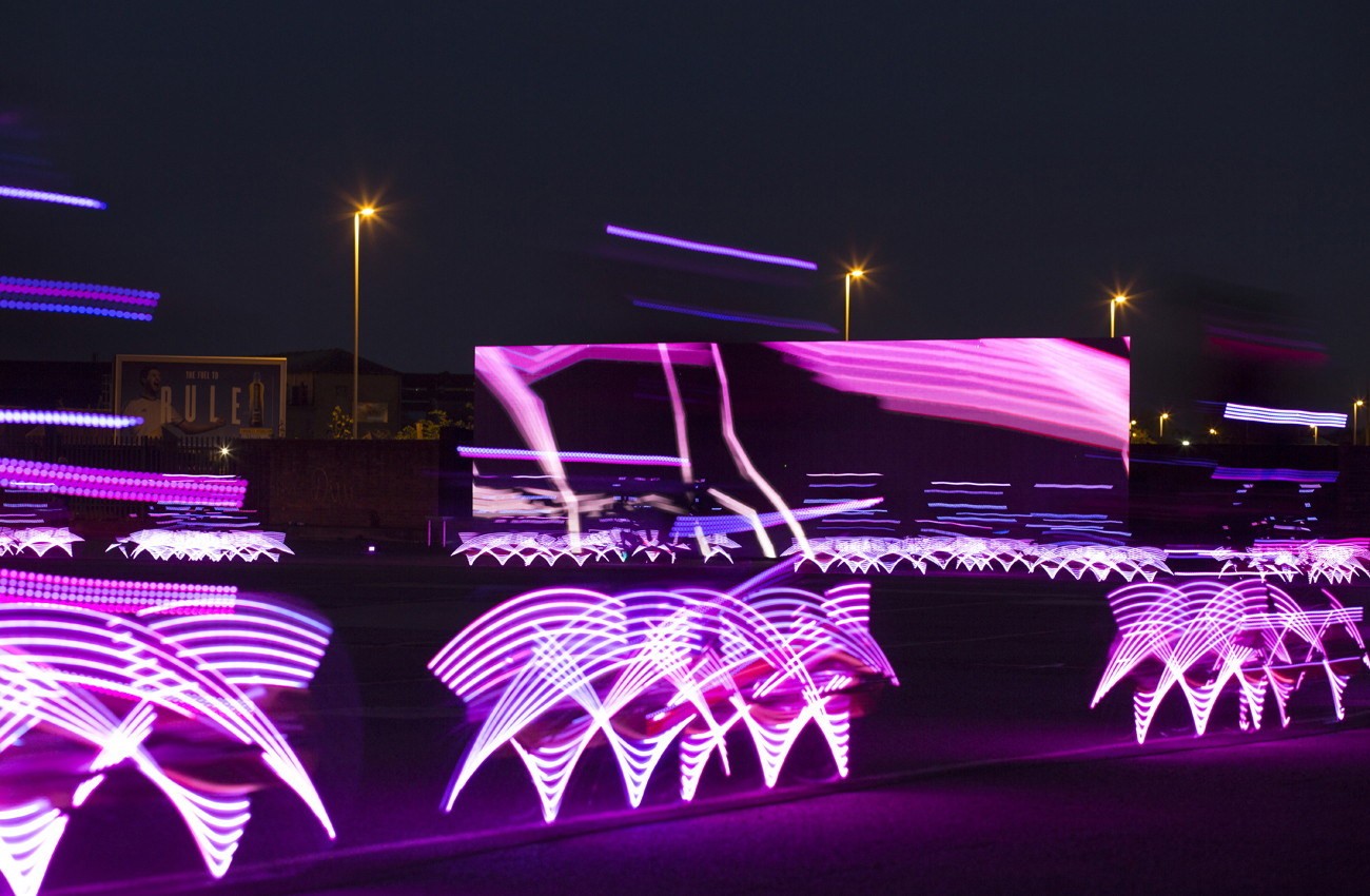 As a site responsive work Speed of Light is a physical articulation of space and location as well as a more detailed exploration of collective action, intentional movement and a unique application of digital lighting technologies involving minimum production infrastructure. All the equipment is worn by the participants and controlled using a remote wireless system.