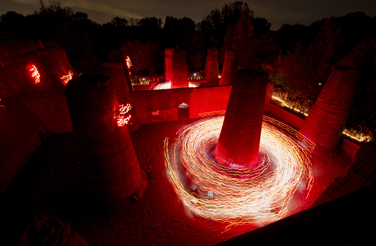 We have presented the work in sensitive rural environments to the extremes of post-industrial landscapes, but in each location it allows us to look again at familiar or previously unseen space, and recognise their beauty and significance. The work uses light as a medium to communicate both the energy and commitment of each individual and the beauty of people working together bound by as strange symmetry and a common purpose.