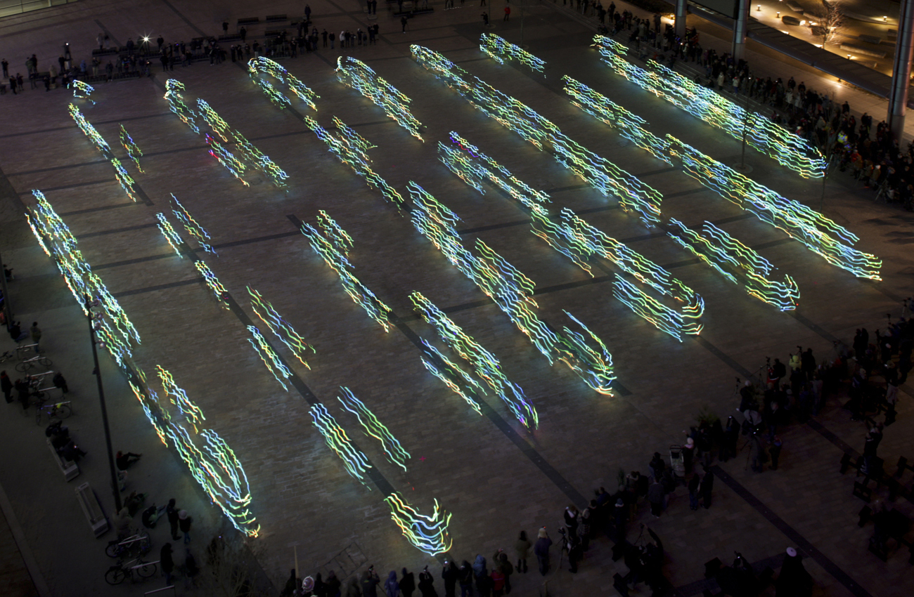 Speed of Light is a stunning public art performance fusing sport and culture that raises endurance running to the realm of the extraordinary through the mass choreography of hundreds of runners in wireless controlled light-suits.